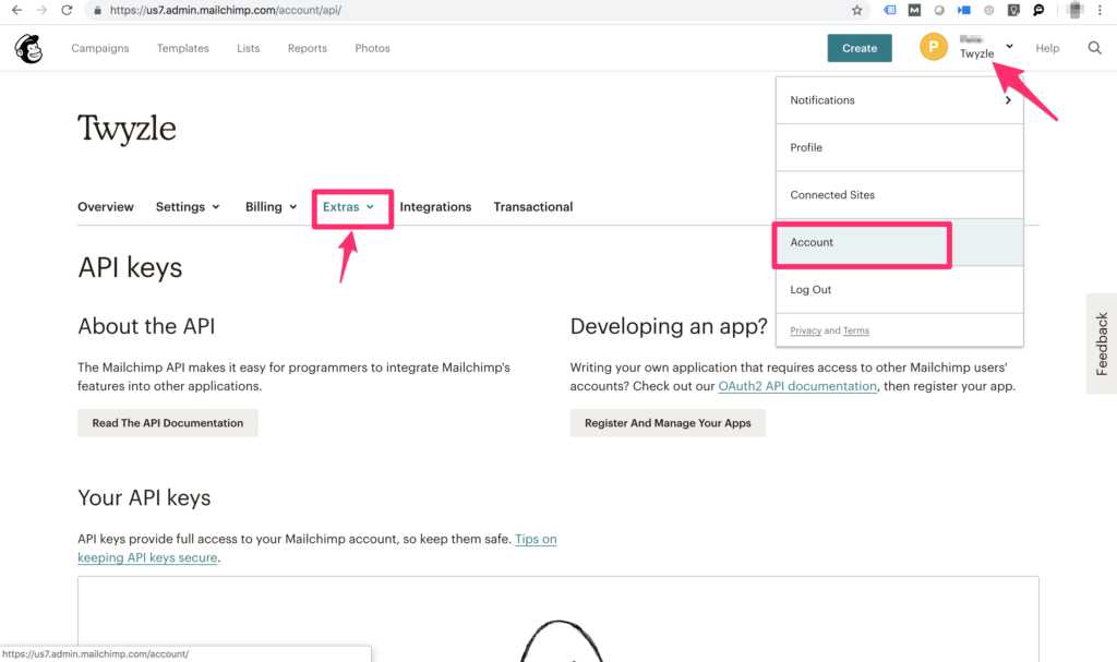 Once your account is created, navigate to the api page under Accounts Settings > Extras > API Keys
