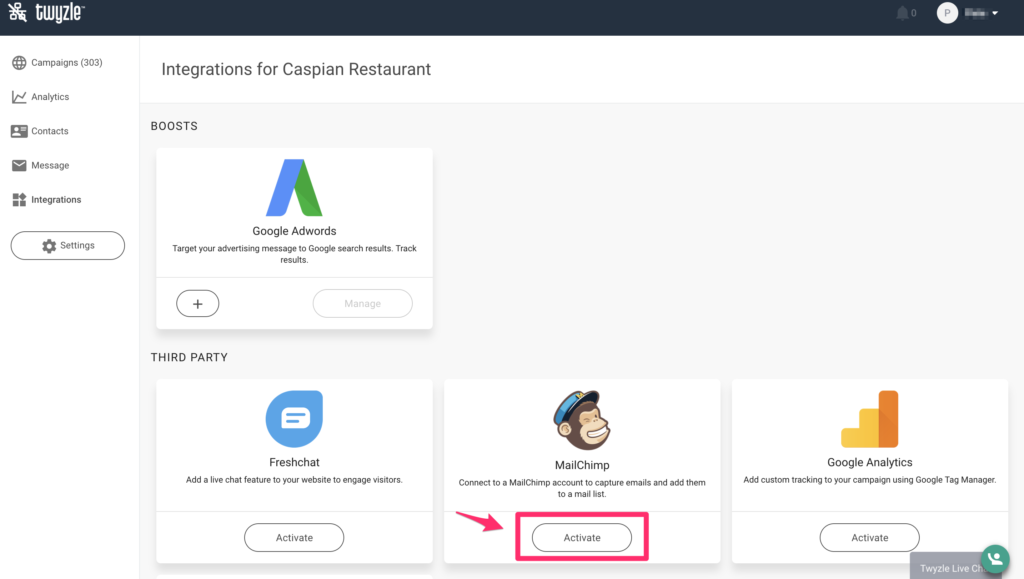 Find the site you want to activate Mailchimp > click on the settings menu in the top right corner and select “Integrations” from the list.