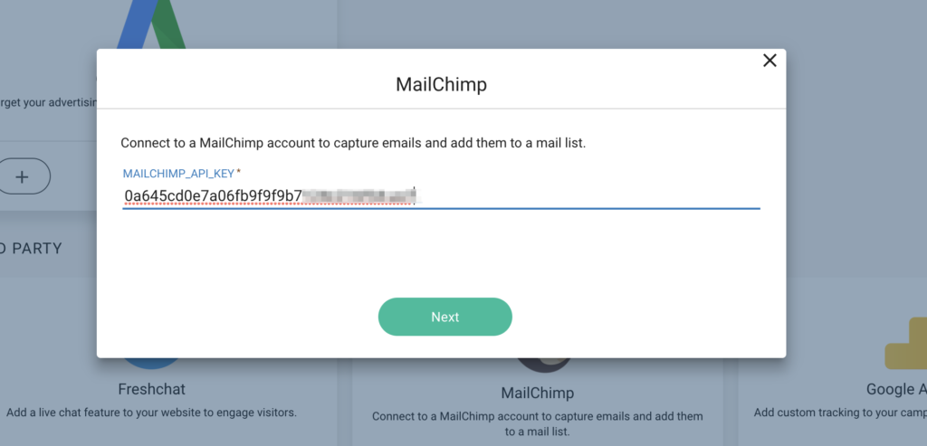 Next, click the Mailchimp “activate” button and enter the API key you copied earlier from Mailchimp.
