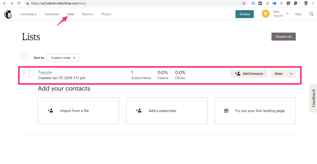 The next step is to create a list. Navigate to “Lists” and click the “Create list” button.